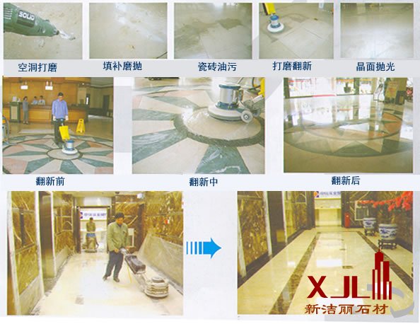 5、结晶处理:采用有针对性的结晶粉或结晶药剂,在专用设备重压及其与石材磨擦产生的高温双重作用下,通过物理和化学综合反应,在石材表面进行结晶排列,形成一层清澈、致密、坚硬的保护层,起到为石材表面加光、加硬的作用,这道程序十分重要,是为今后的保养打好基础。